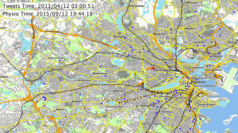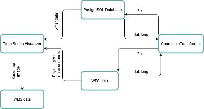 The objective of this exercise was to create a Java-based program that displays Twitter data stored in a PostgreSQL database and physiological measurement data stored in a WFS database. The data was animated as a time series and displayed on a basemap retrieved from a WMS.