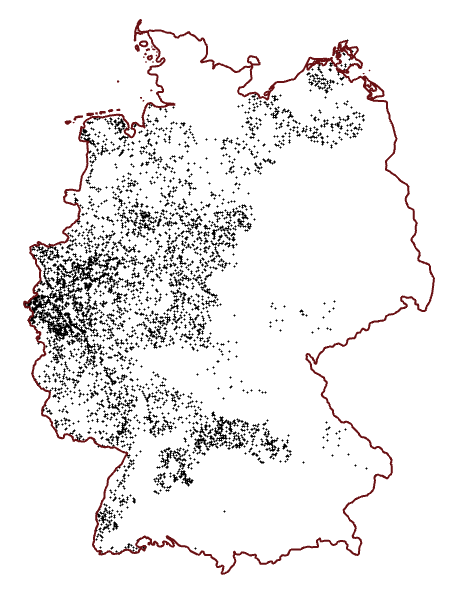 Finally I found a website called alleburgen.de with a very detailed web map with approximately 25,000 listed castles. Unfortunately the website did not offer a download of a spatial dataset of the castles and a reverse engineering to get the data from the website lies beyond my competencies. I then decided to join the table with the total numbers of castles per district on the website with a shapefile of the districts of Germany. On the resulting table I used the dot-density method to create an estimation of the geographical distribution of the castles in Germany.