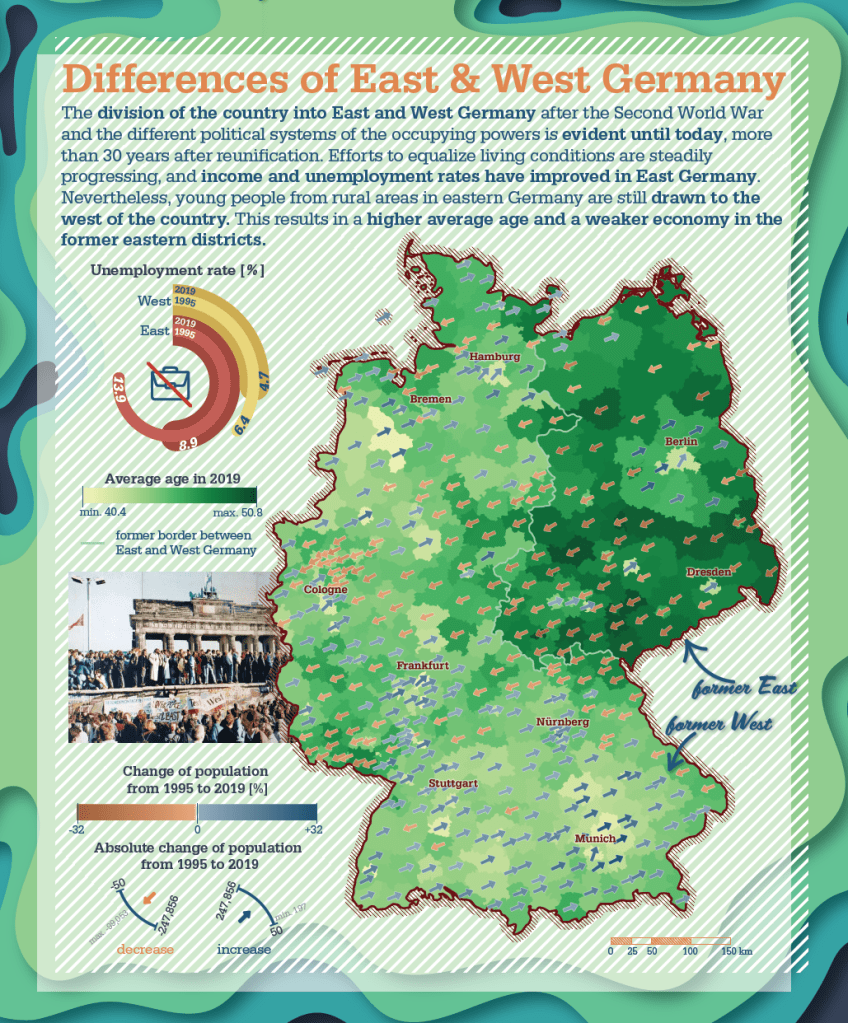 For the third map on my poster I wanted the reader to get a social-economical insight in the country of Germany. For this I chose to show the still existing differences between the former eastern and western part of the country, more than 30 years after the reunification. The map shows two datasets: the average age and the change of population in each district, both retrieved from the Federal Statistical Office of Germany