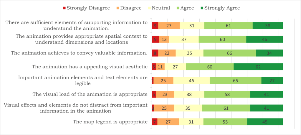 To evaluate the quality and effectiveness of the created map animations an online survey was conducted. The evaluation results showed that the animations made a largely positive impression on the survey participants. However, the most frequent point of criticism was overwhelming or confusing information load due to too many elements, too small elements, or too quickly moving elements in the animations.