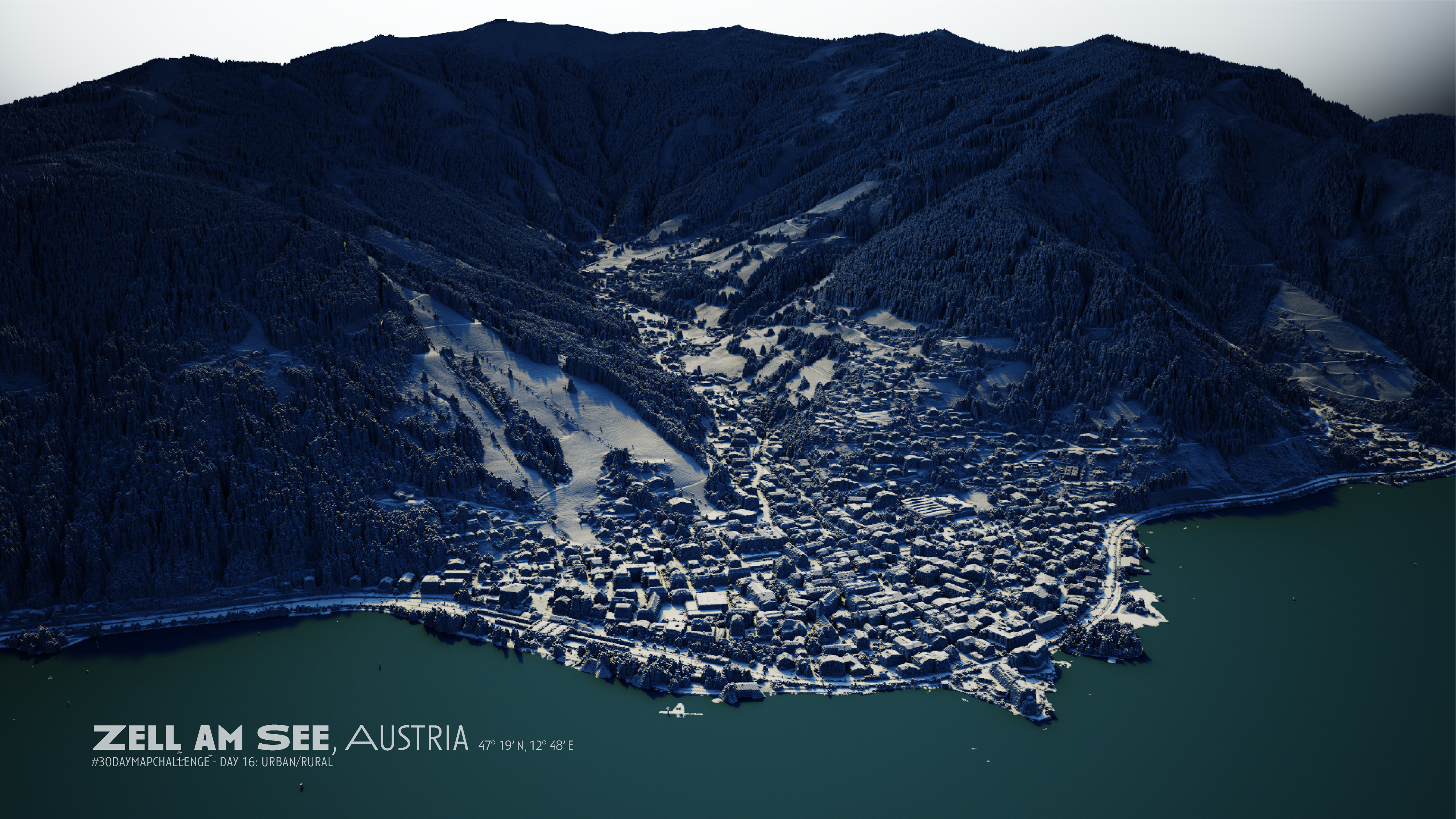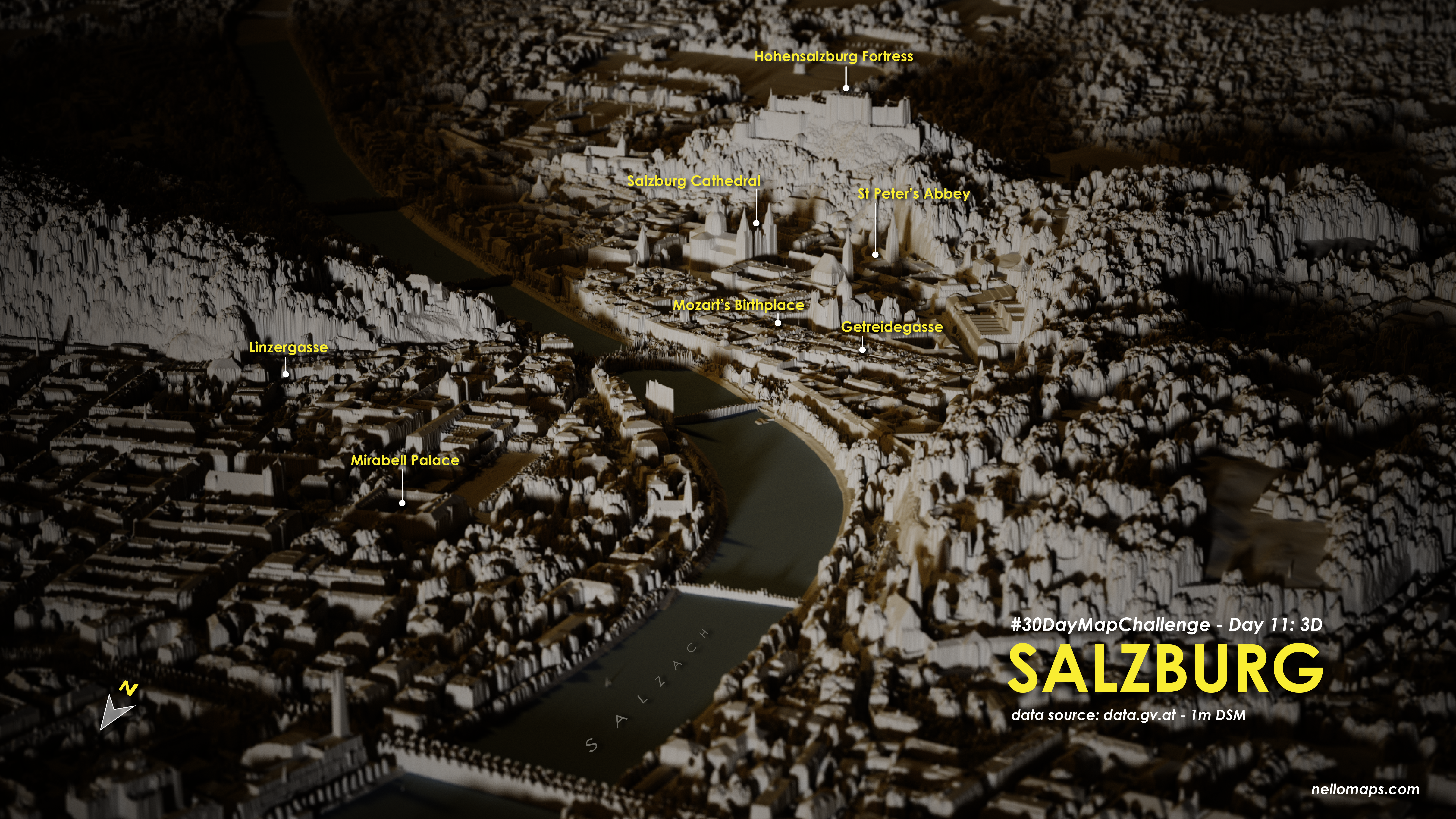 I got to know Aerialod by following the 30DayMapChallenge in 2020. I admired the amazing results of other creators and decided to give it a try as well. I used a very high-resolution DSM of the city of Salzburg in Austria and just fiddled around until I got a nice looking, sort of atmospheric and miniature looking visualization of the city’s geography. The final touches of callout labels and a 3D label of the river Salzach were added in Adobe Illustrator.