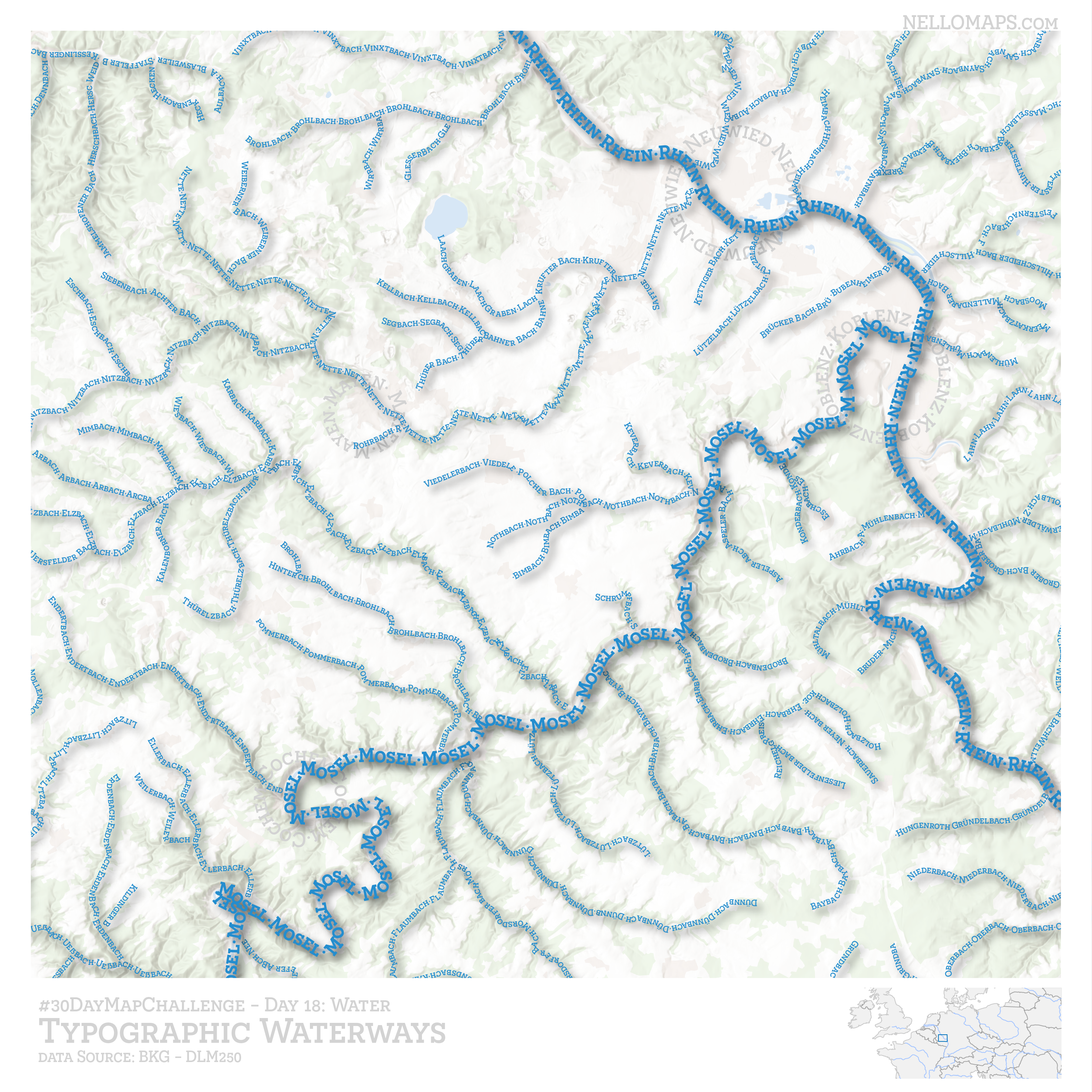 A river map made from text labels. I tried to create this map with the ArcGIS Pro labelling settings first but couldn’t achieve a satisfying result. That’s why I used ArcGIS Maps for Adobe Creative Cloud to import the geometries and added the text manually via the text on path tool.