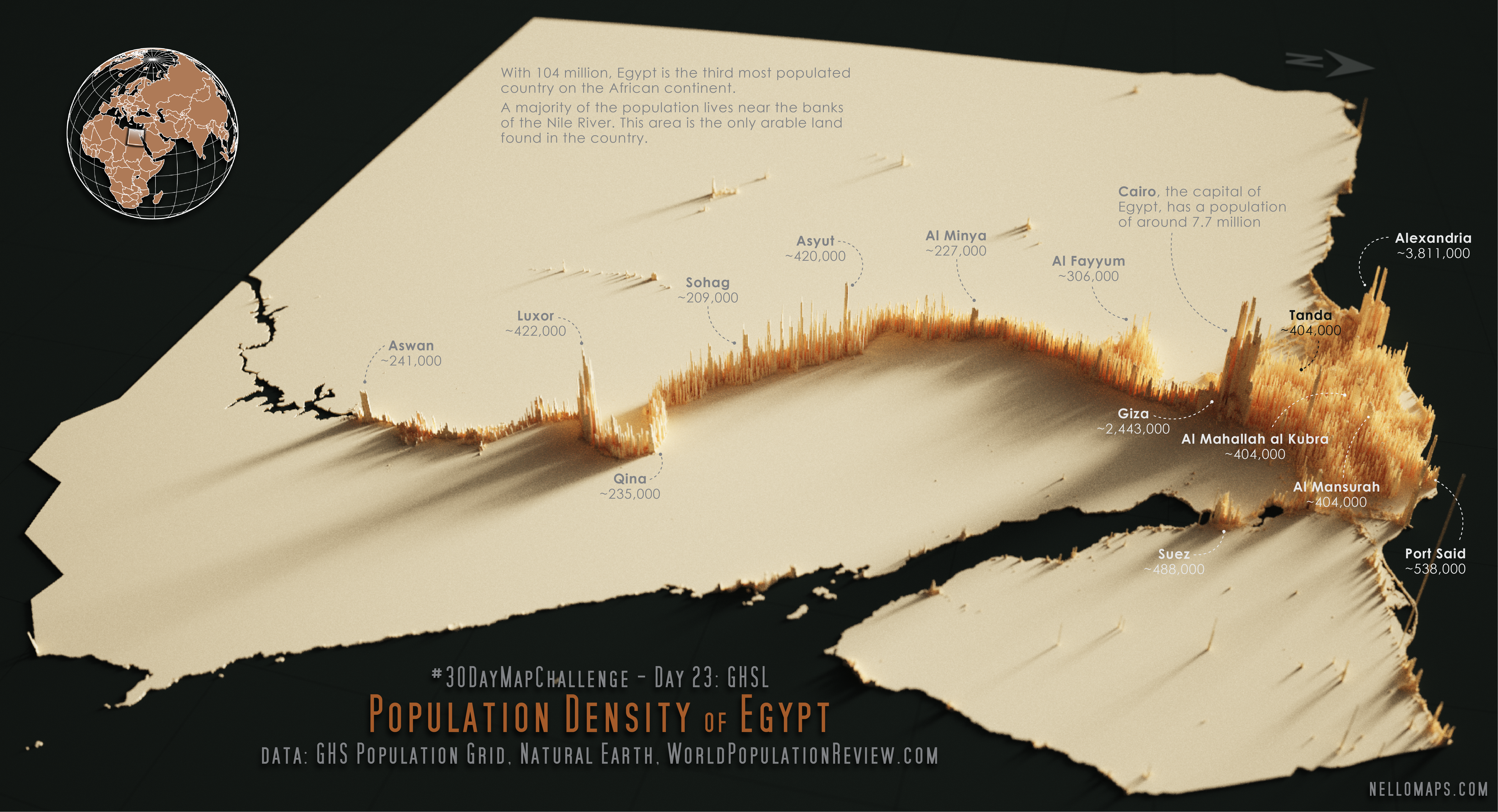 I found out about the existence of the GHSL database through this challenge, and I am very thankful for that. On the search for interesting aspects of population in different countries I learned about Egypt’s unique distribution of population along the Nile River and decided to make it the topic of my map. I took inspiration from Alasdair Rae’s workflow and a design by @KennthWong on population maps made with Aerialod.