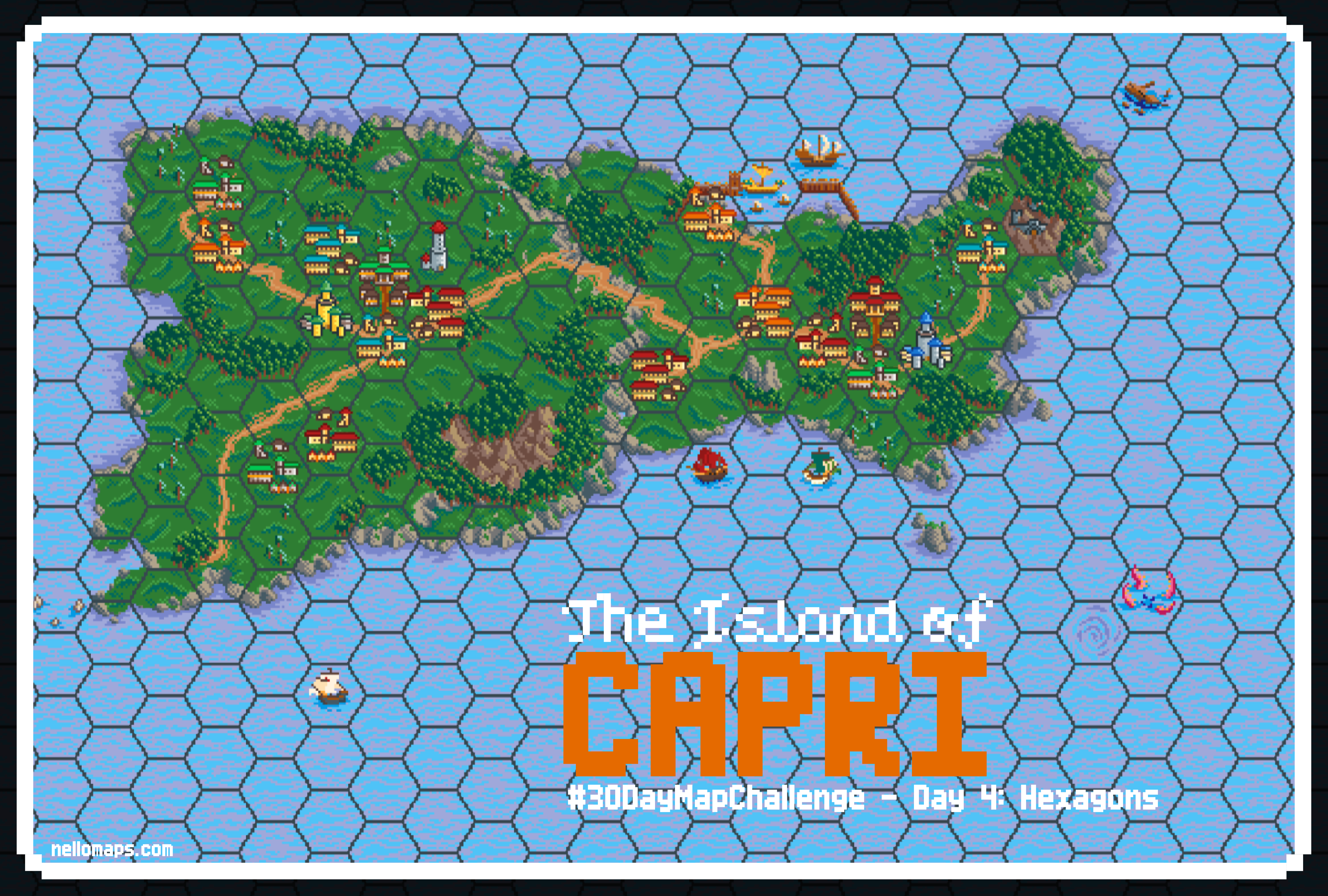The look of hex maps from video games was the first association when I first read todays topic. After a little bit of research, I found a beautifully designed set of hex tiles in a pixel style and decided to use it. In addition, I found a neat tool called Hex Kit to build hex maps. Lastly, I just searched for a random small island to map and decided on the Italian island of Capri. For the mapping process I used Google Maps as a reference and manually placed the tiles in the Hex Kit application.