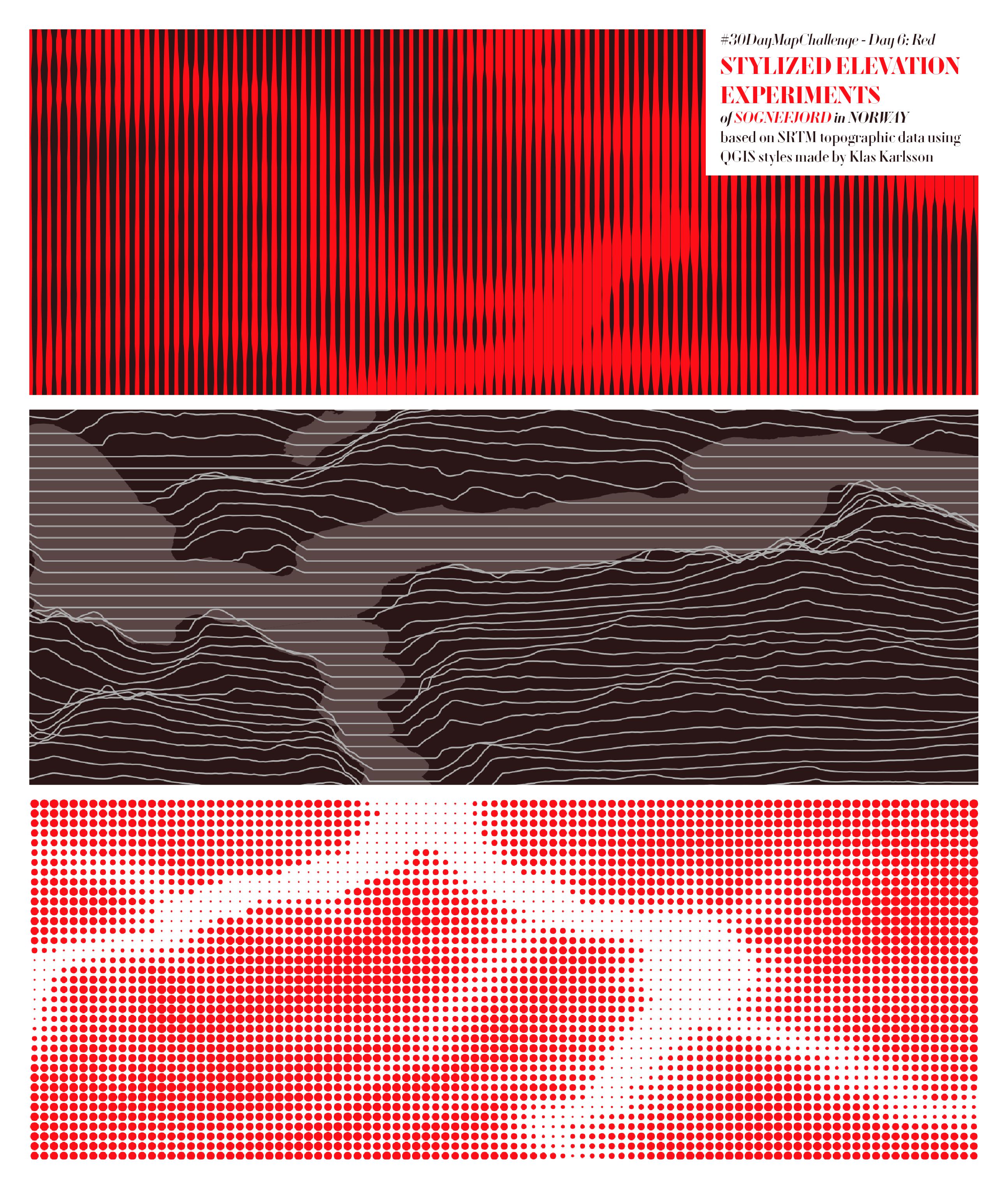 While browsing Twitter I found a post of @klaskarlsson in which he presented a few screenshots of his QGIS styles to symbolize elevation in a unique way. I simply used a red colour palette for the resulting map designs to justify the results of my experiments for today’s challenge “red”.